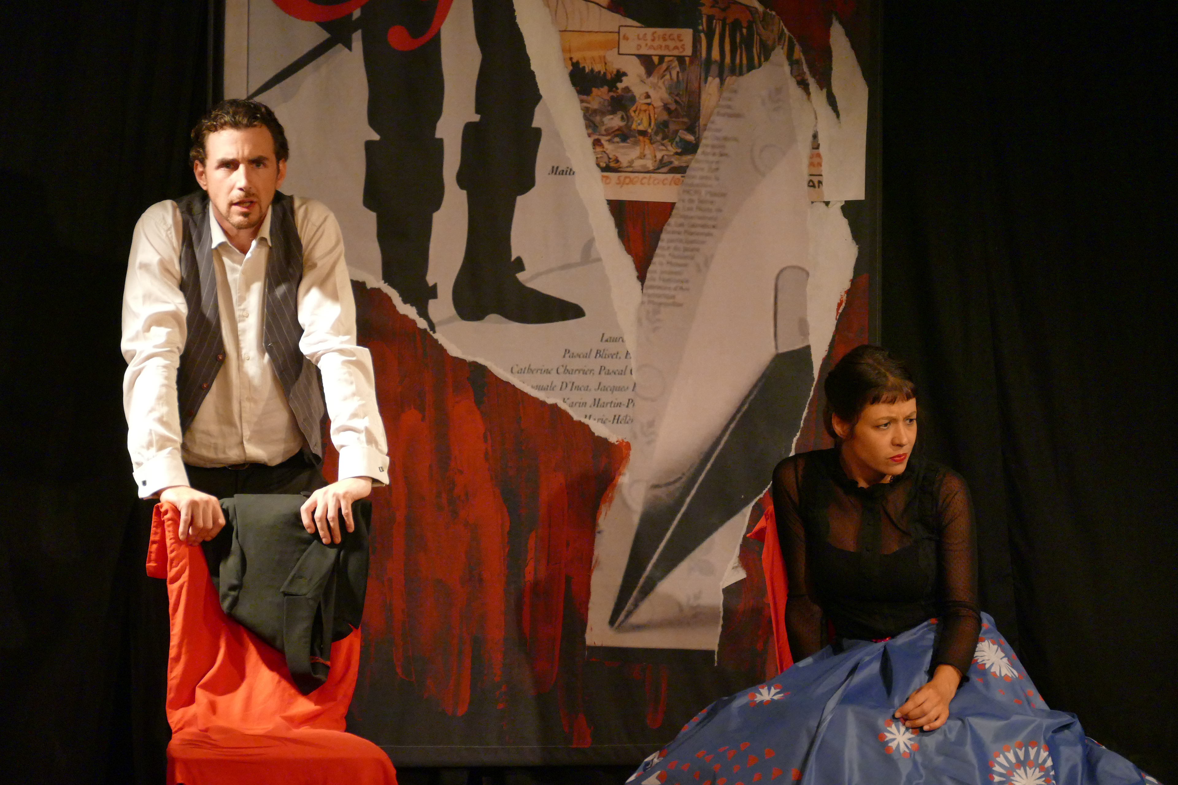 Sur la scène également, un panneau recouvert de toile à la manière de Raymond Haines et Jacques Villeglé. Une superposition d’affiches d’époques différentes pour placer la scène jouée dans une autre perspective : l’œuvre perdure par-delà la vie de ses créateurs et a sa vie propre.