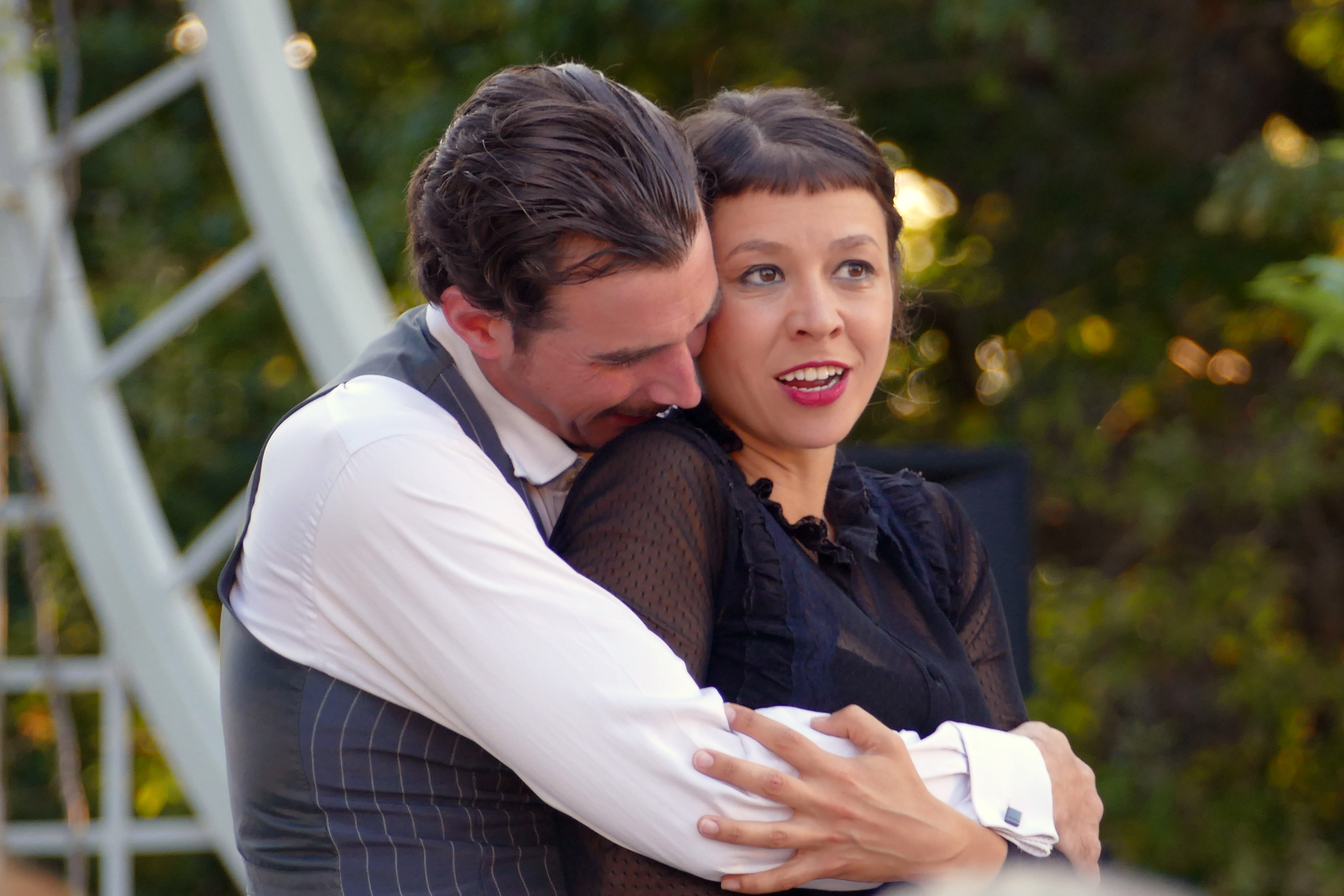 Edmond Rostand et son épouse se retrouvent ainsi dans un espace indéterminé qui devient tour à tour, par la simple évocation ou la présence d’une affiche ou d’un objet, leur appartement de jeunesse, les coulisses du théâtre de la porte Saint-Martin ou la Villa Arnaga du Pays Basque.